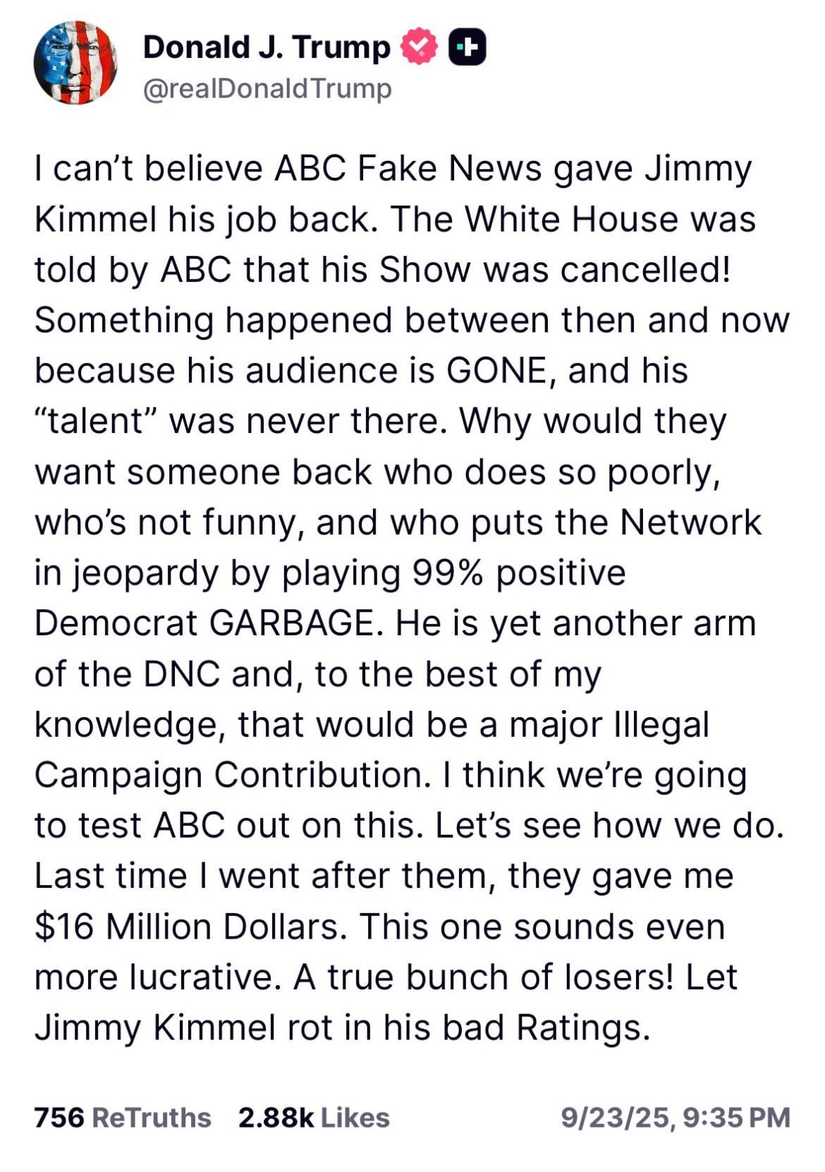 Kimmel will get a good ratings bump mainly out of curiosity...for just a few days, then back in the dumpster. He and his 100+ person crew should get their CVs updated abd start shopping for a new gig now as I'll be stunned if Disney renews his contract when it expires 1-Jun-2026. Then, ABC needs to find new content, a test pattern will get better ratings.